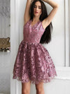 Elegant Sleeveless Mulberry Purple Floral Lace V-neck A-line Tulle Short Homecoming Dress, HD3045