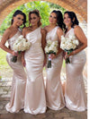 Shiny One Shoulder Soft Satin Sleeveless Floor-Length Mermaid Maxi Mermaid Bridesmaid Dresses, BD3409