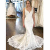 V-Neck Mermaid Unique Design Modest Affordable Long Wedding Dresses with lace appliques , WD00563