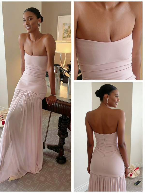 Flowy Blush Pink Chiffon Strapless Ruched Waist Formal Gown